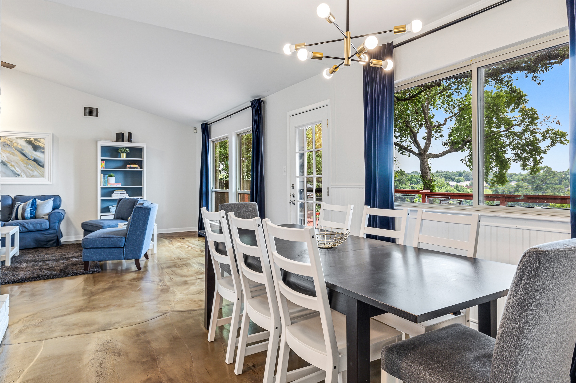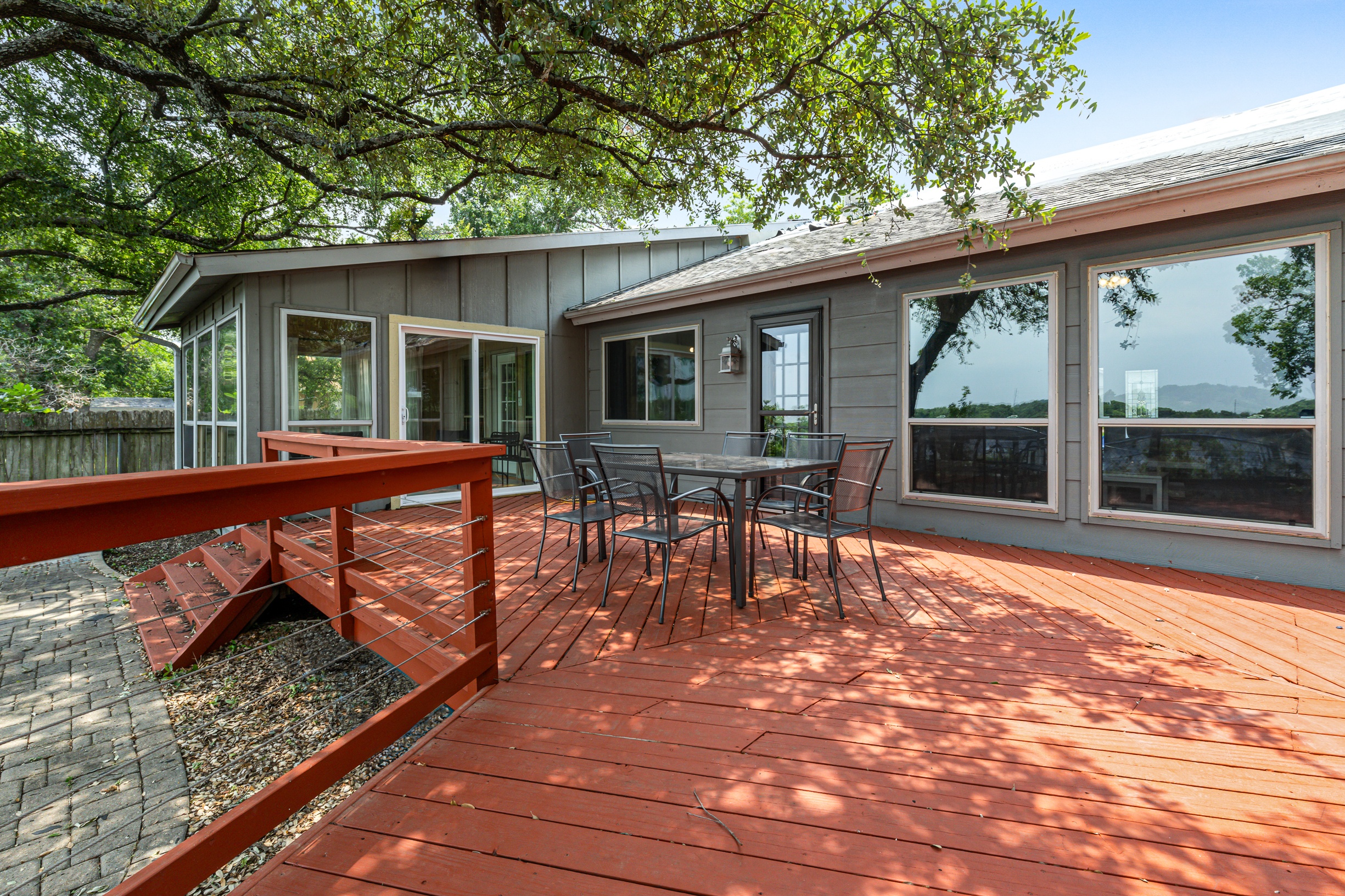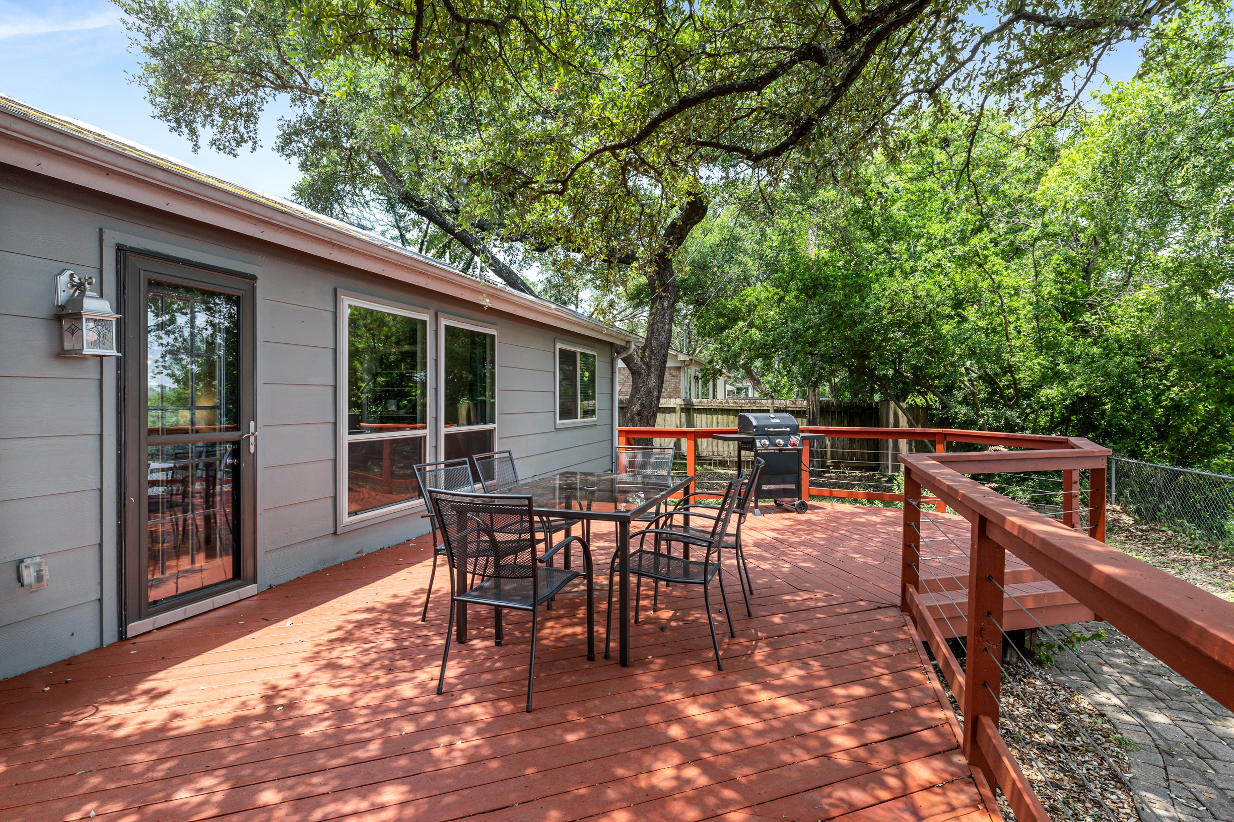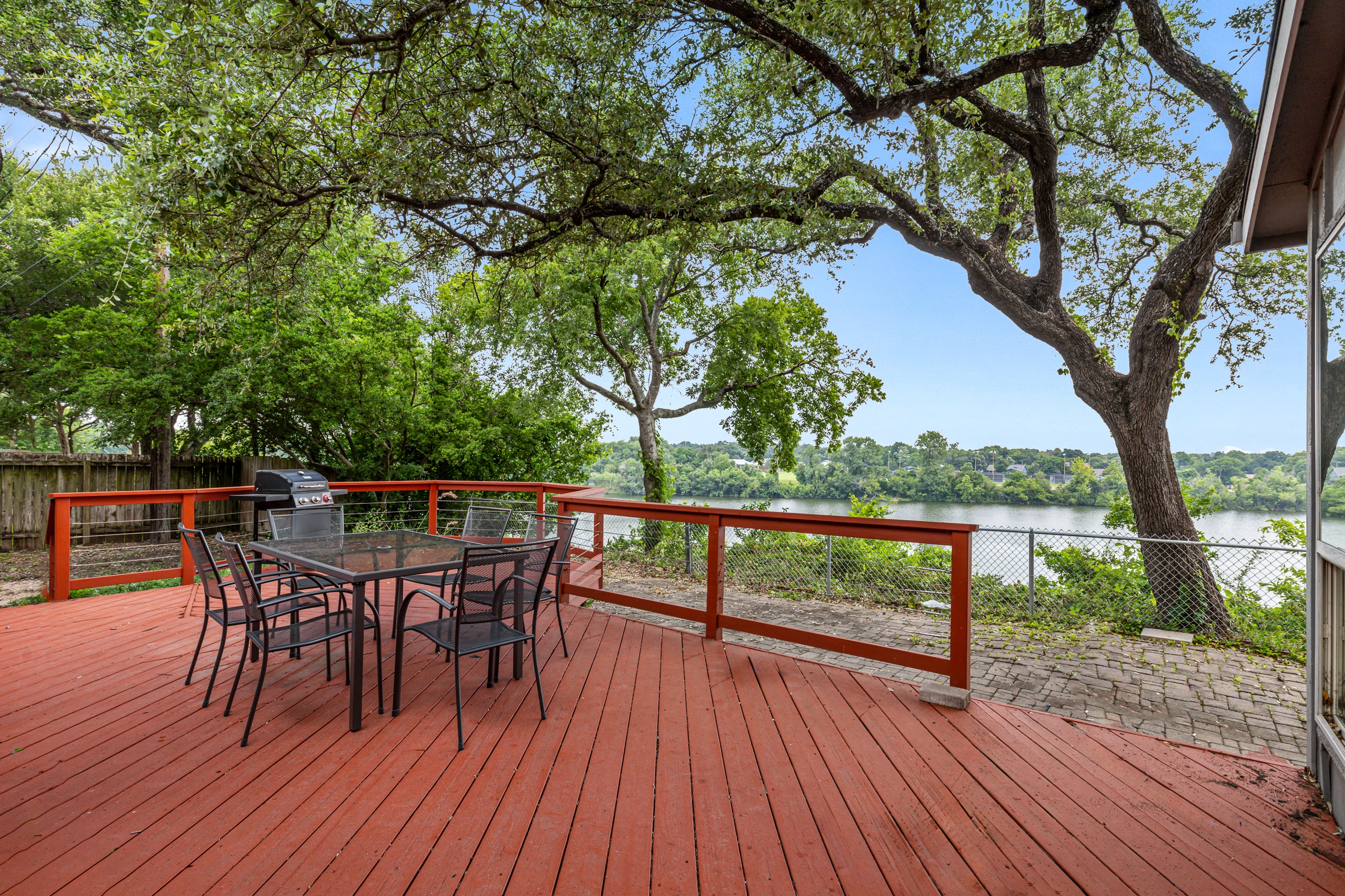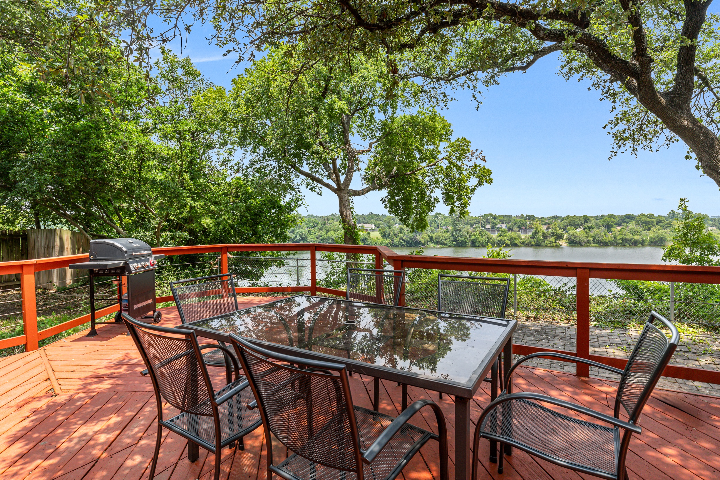 Please note that a $300 refundable security deposit is charged in addition to the total shown. Dogs are allowed with prior approval and a one time $240 pet fee. A beautiful remodeled home overlooking a small private lake. Enjoy the view from the deck, and still have easy highway access to downtown and the Domain. Home has 5 beds and sleeps up to 8 adults or 10 guests total. For the families, we have a pack and play, a high chair, as well as a few toys and games for the kids. The 2200sqft home has gorgeous stained concrete flooring throughout, updated kitchen & bathrooms, huge deck, and a sunroom facing the lake with lots of windows. The kitchen is stunning with all stainless steel appliances, gas range, granite, and glass tile. The bathrooms have custom glass tile tub & shower surrounds, granite counter tops and custom sink vessels. Of course the home has central air and heat throughout as well as ceiling fans in each room. The living room has plenty of seating, and the dining room accommodates up to 8 adults. The large deck has plenty of seating with a patio table and chairs. It truly is a beautiful view - especially at sunset! Please note that the fireplace is decorative only, and the garage is a small 1 car garage. The home has a maximum occupancy of 8 adults and 10 people total. City of Austin has an occupancy limit of 6 unrelated adults. Minimum age requirement of 25 years old. Cats are not allowed; dogs are allowed with prior approval and additional fee. The neighborhood pool, playground, tennis, and volleyball courts are only available for guests staying 30 days or longer. The small lake behind the home is privately owned and although it provides a beautiful view for your stay, guests are not allowed to go on the lake unless they join the recreation center. Minimal, we live a few houses away. The home is in a quiet residential neighborhood with a surprising lake view for being in Austin. It's tucked away yet close to major highways. Please note that the lake is just for the view, and there is no access allowed or possible from the home.