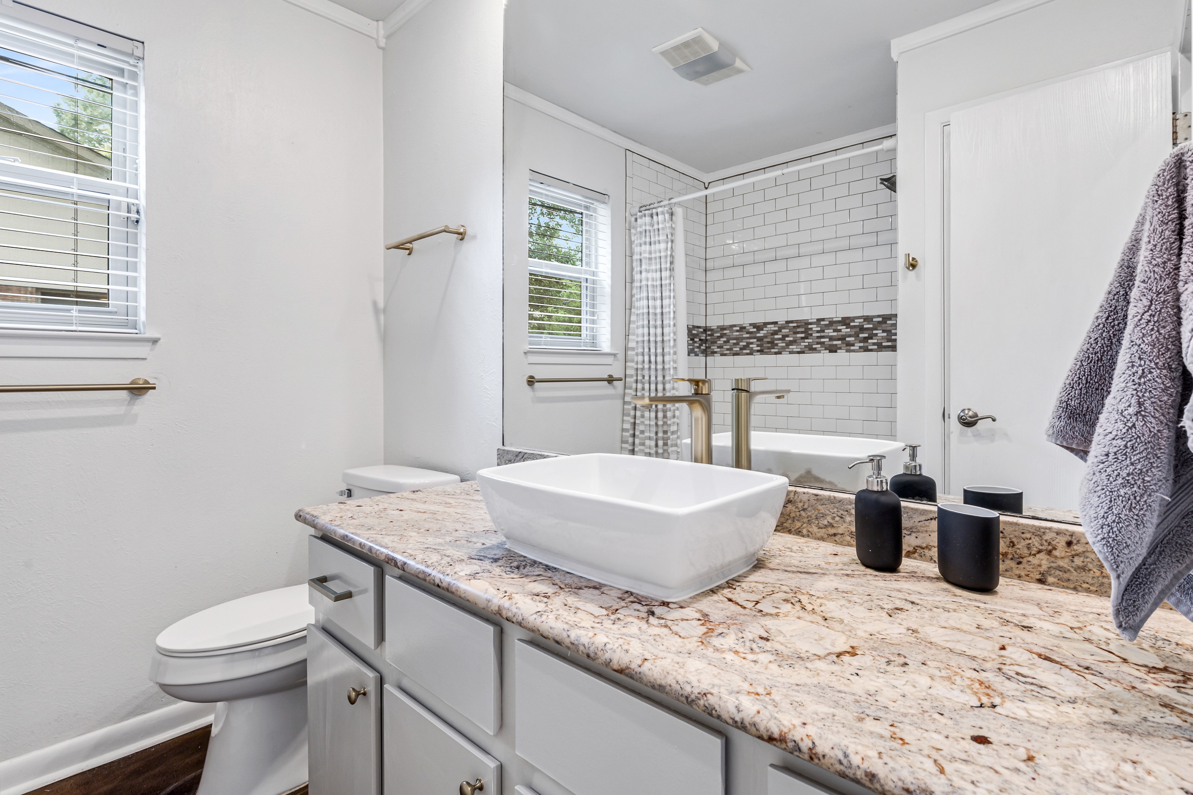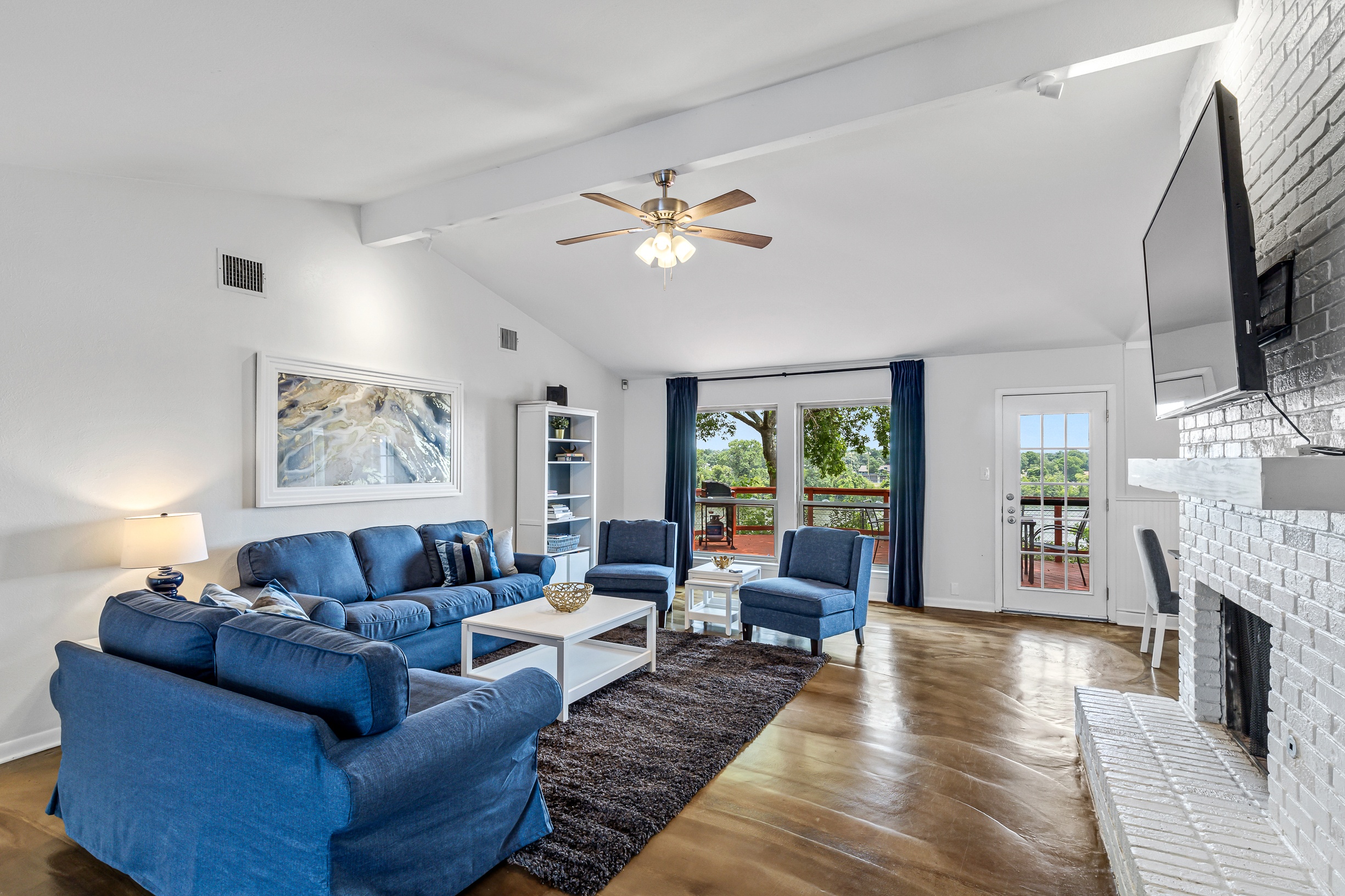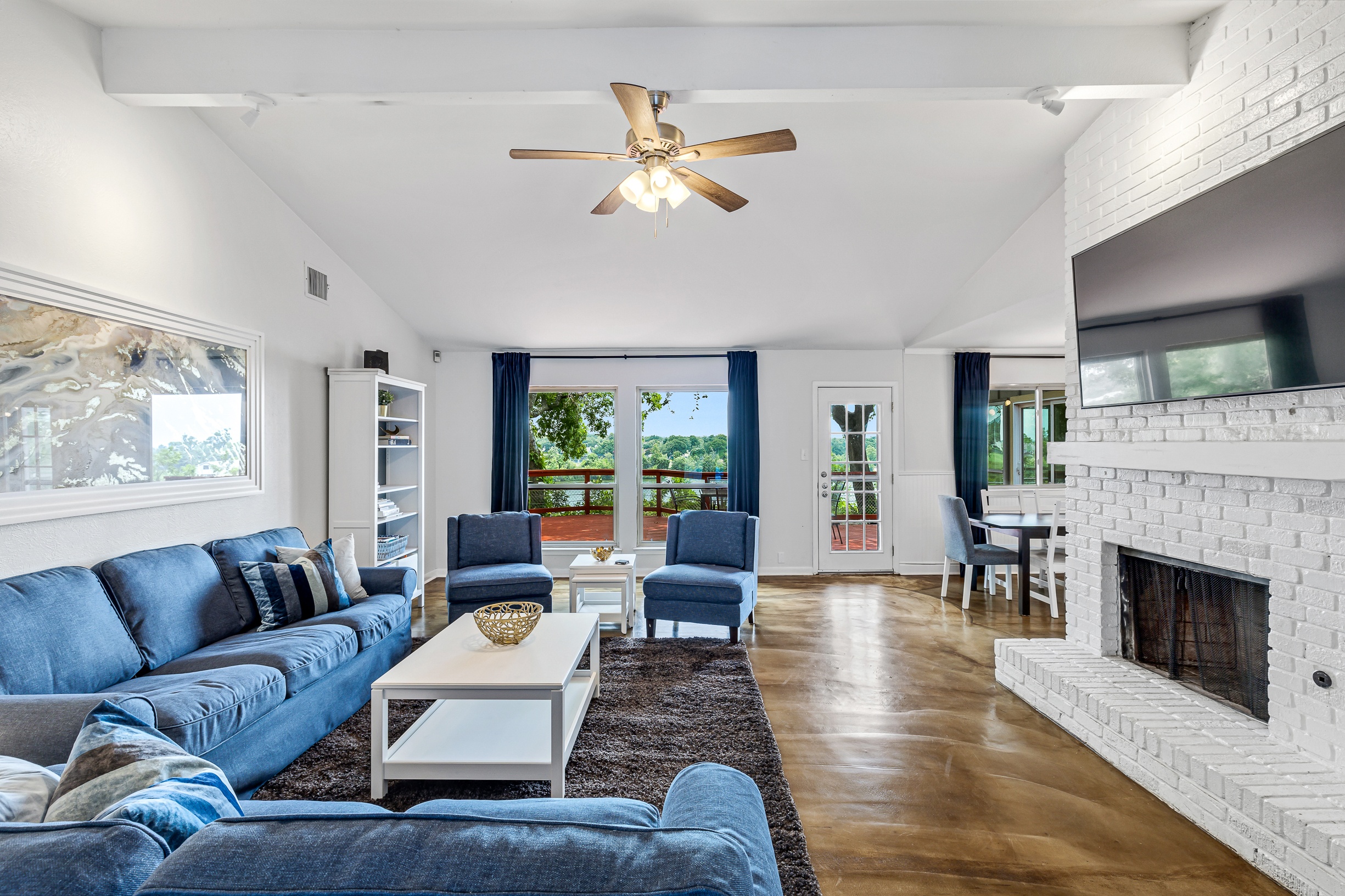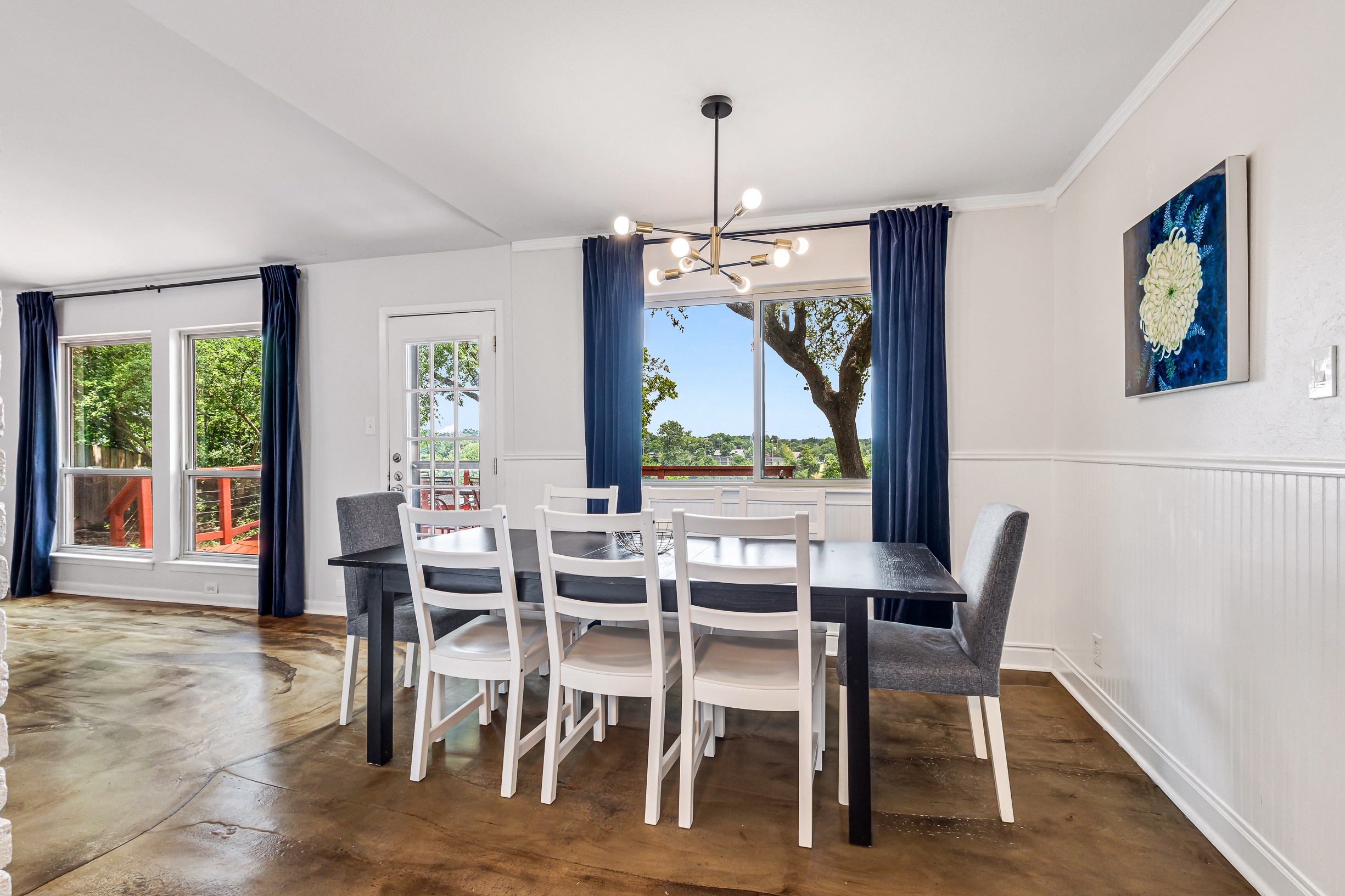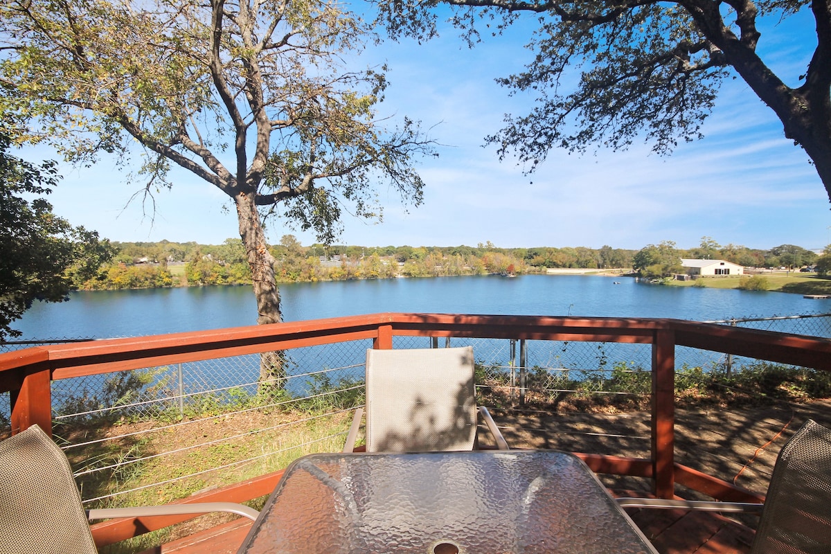 Please note that a $300 refundable security deposit is charged in addition to the total shown. Dogs are allowed with prior approval and a one time $240 pet fee. A beautiful remodeled home overlooking a small private lake. Enjoy the view from the deck, and still have easy highway access to downtown and the Domain. Home has 5 beds and sleeps up to 8 adults or 10 guests total. For the families, we have a pack and play, a high chair, as well as a few toys and games for the kids. The 2200sqft home has gorgeous stained concrete flooring throughout, updated kitchen & bathrooms, huge deck, and a sunroom facing the lake with lots of windows. The kitchen is stunning with all stainless steel appliances, gas range, granite, and glass tile. The bathrooms have custom glass tile tub & shower surrounds, granite counter tops and custom sink vessels. Of course the home has central air and heat throughout as well as ceiling fans in each room. The living room has plenty of seating, and the dining room accommodates up to 8 adults. The large deck has plenty of seating with a patio table and chairs. It truly is a beautiful view - especially at sunset! Please note that the fireplace is decorative only, and the garage is a small 1 car garage. The home has a maximum occupancy of 8 adults and 10 people total. City of Austin has an occupancy limit of 6 unrelated adults. Minimum age requirement of 25 years old. Cats are not allowed; dogs are allowed with prior approval and additional fee. The neighborhood pool, playground, tennis, and volleyball courts are only available for guests staying 30 days or longer. The small lake behind the home is privately owned and although it provides a beautiful view for your stay, guests are not allowed to go on the lake unless they join the recreation center. Minimal, we live a few houses away. The home is in a quiet residential neighborhood with a surprising lake view for being in Austin. It's tucked away yet close to major highways. Please note that the lake is just for the view, and there is no access allowed or possible from the home.