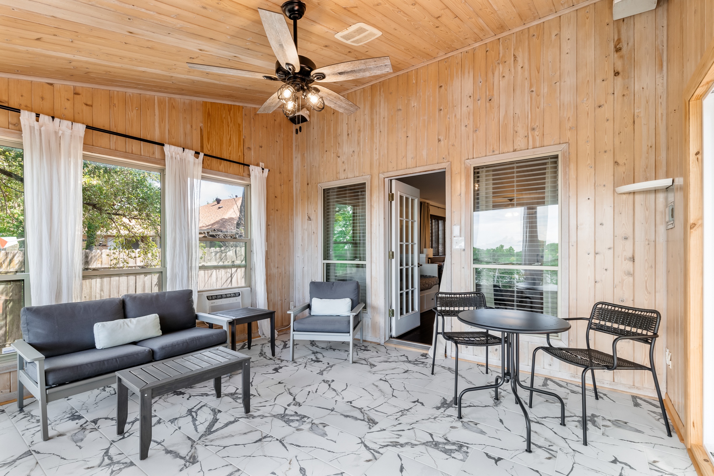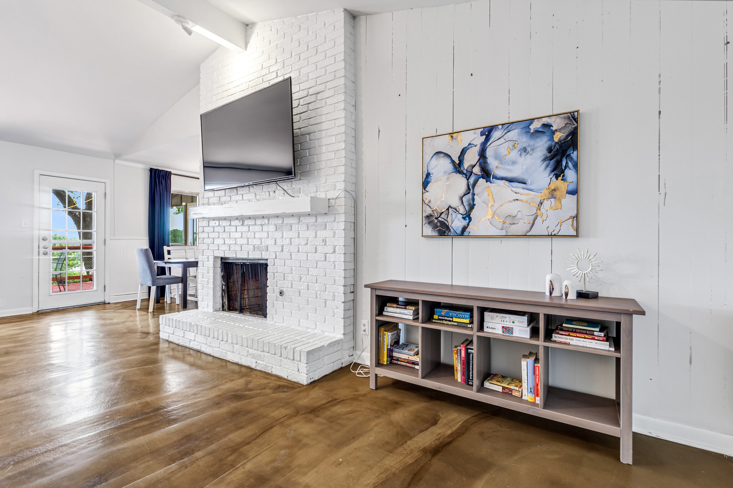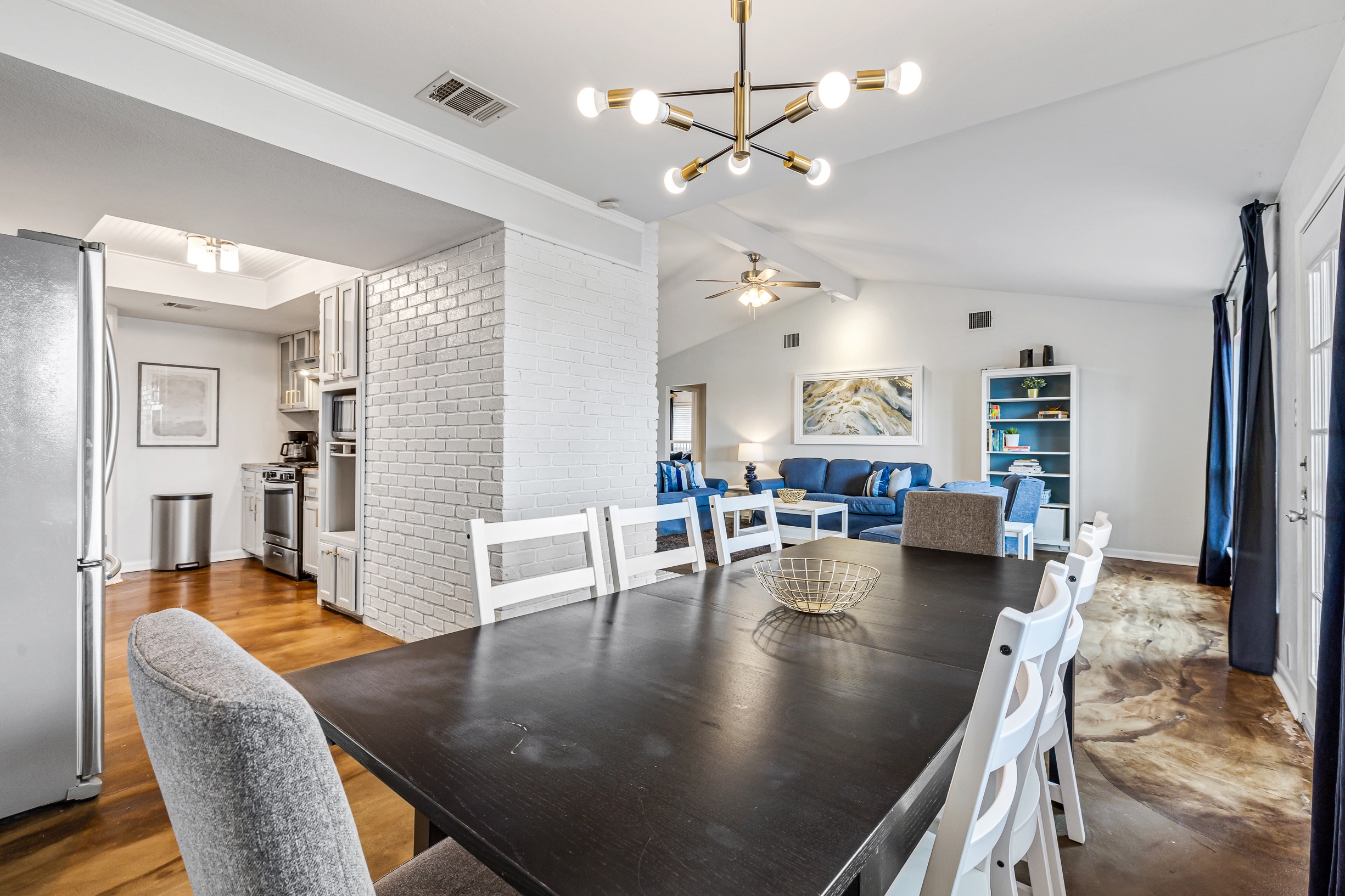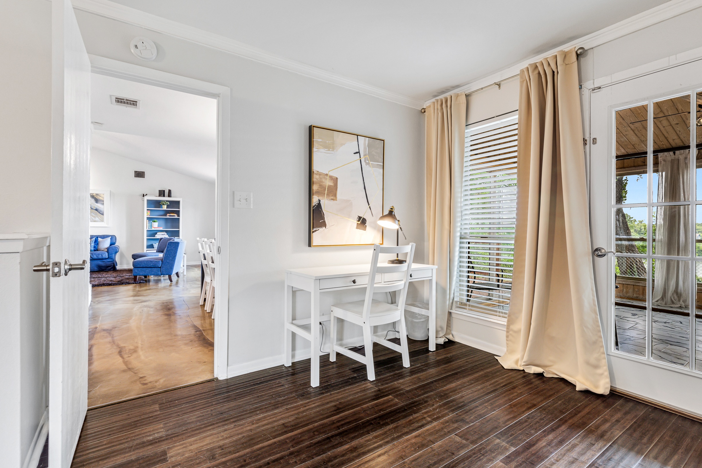 Please note that a $300 refundable security deposit is charged in addition to the total shown. Dogs are allowed with prior approval and a one time $240 pet fee. A beautiful remodeled home overlooking a small private lake. Enjoy the view from the deck, and still have easy highway access to downtown and the Domain. Home has 5 beds and sleeps up to 8 adults or 10 guests total. For the families, we have a pack and play, a high chair, as well as a few toys and games for the kids. The 2200sqft home has gorgeous stained concrete flooring throughout, updated kitchen & bathrooms, huge deck, and a sunroom facing the lake with lots of windows. The kitchen is stunning with all stainless steel appliances, gas range, granite, and glass tile. The bathrooms have custom glass tile tub & shower surrounds, granite counter tops and custom sink vessels. Of course the home has central air and heat throughout as well as ceiling fans in each room. The living room has plenty of seating, and the dining room accommodates up to 8 adults. The large deck has plenty of seating with a patio table and chairs. It truly is a beautiful view - especially at sunset! Please note that the fireplace is decorative only, and the garage is a small 1 car garage. The home has a maximum occupancy of 8 adults and 10 people total. City of Austin has an occupancy limit of 6 unrelated adults. Minimum age requirement of 25 years old. Cats are not allowed; dogs are allowed with prior approval and additional fee. The neighborhood pool, playground, tennis, and volleyball courts are only available for guests staying 30 days or longer. The small lake behind the home is privately owned and although it provides a beautiful view for your stay, guests are not allowed to go on the lake unless they join the recreation center. Minimal, we live a few houses away. The home is in a quiet residential neighborhood with a surprising lake view for being in Austin. It's tucked away yet close to major highways. Please note that the lake is just for the view, and there is no access allowed or possible from the home.