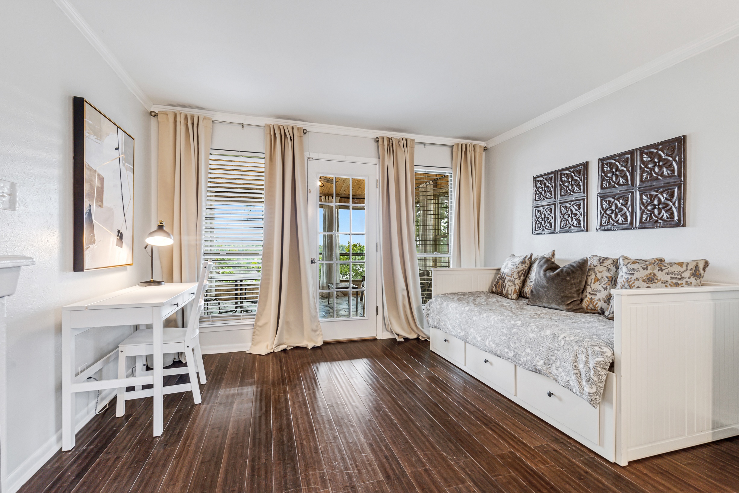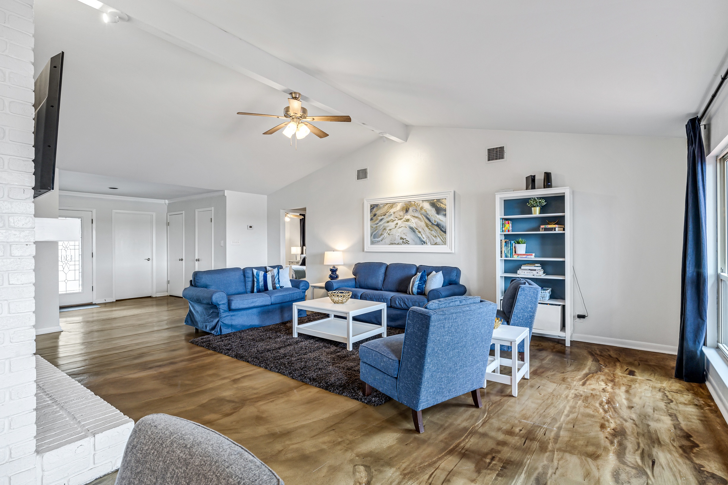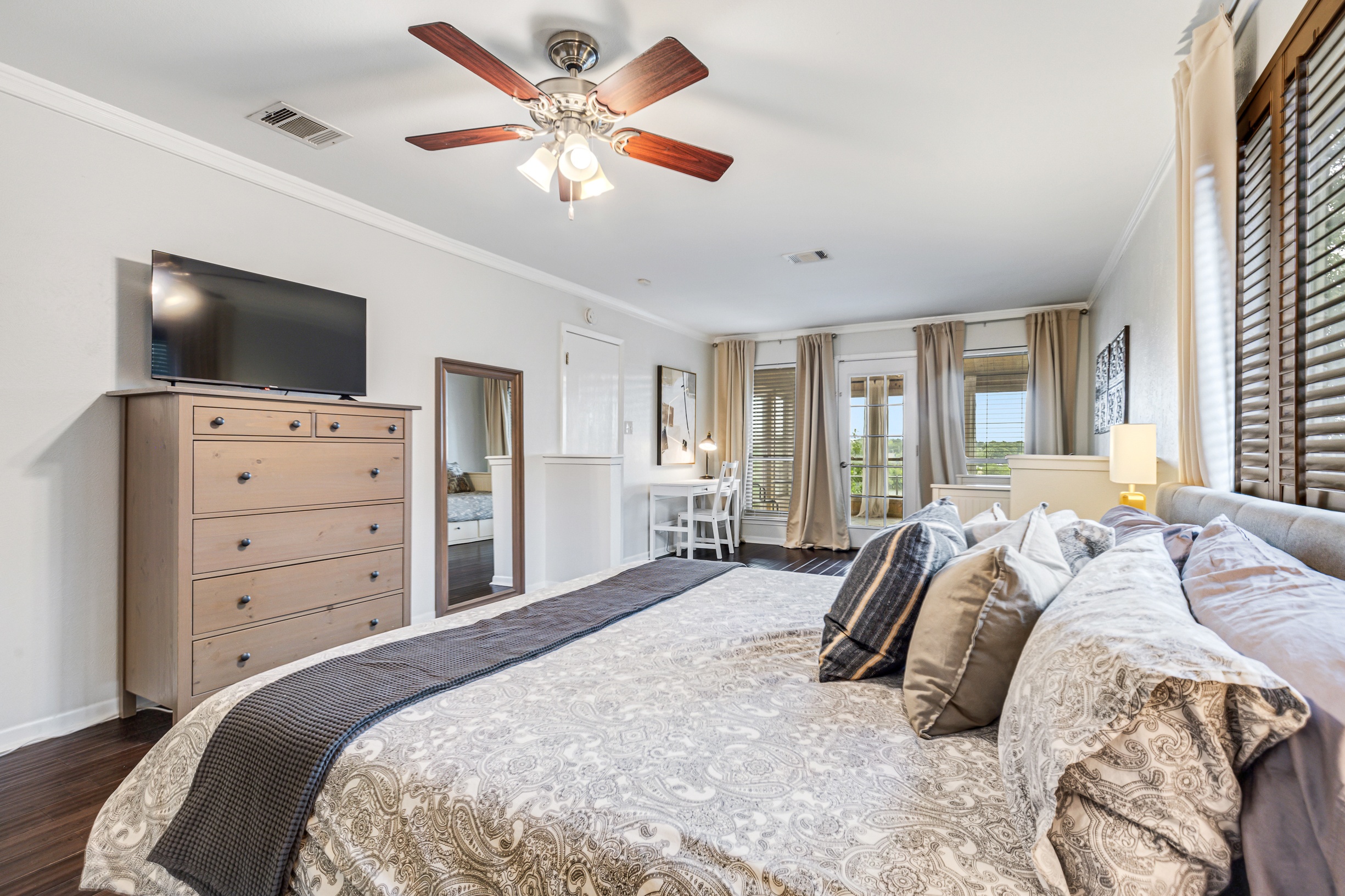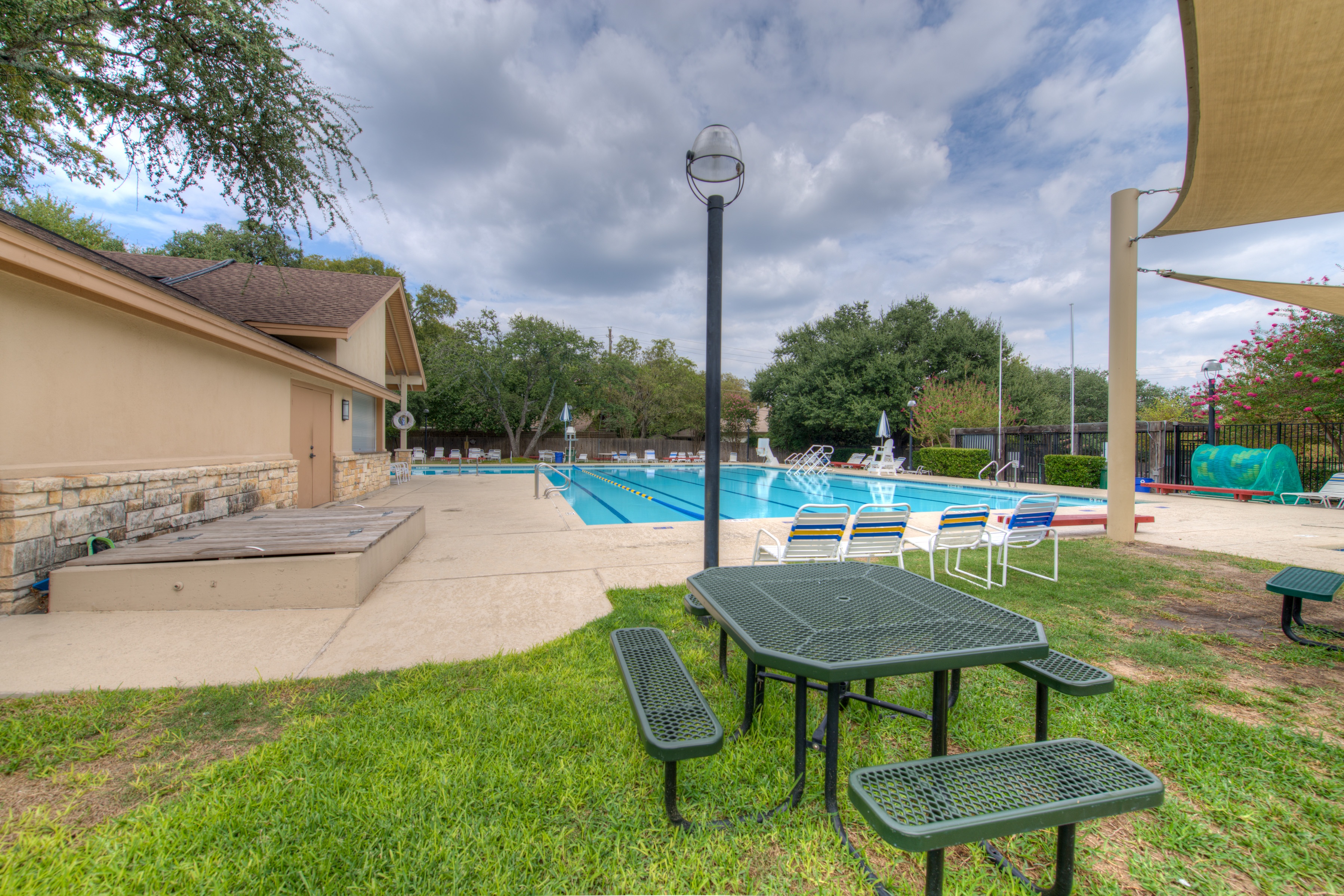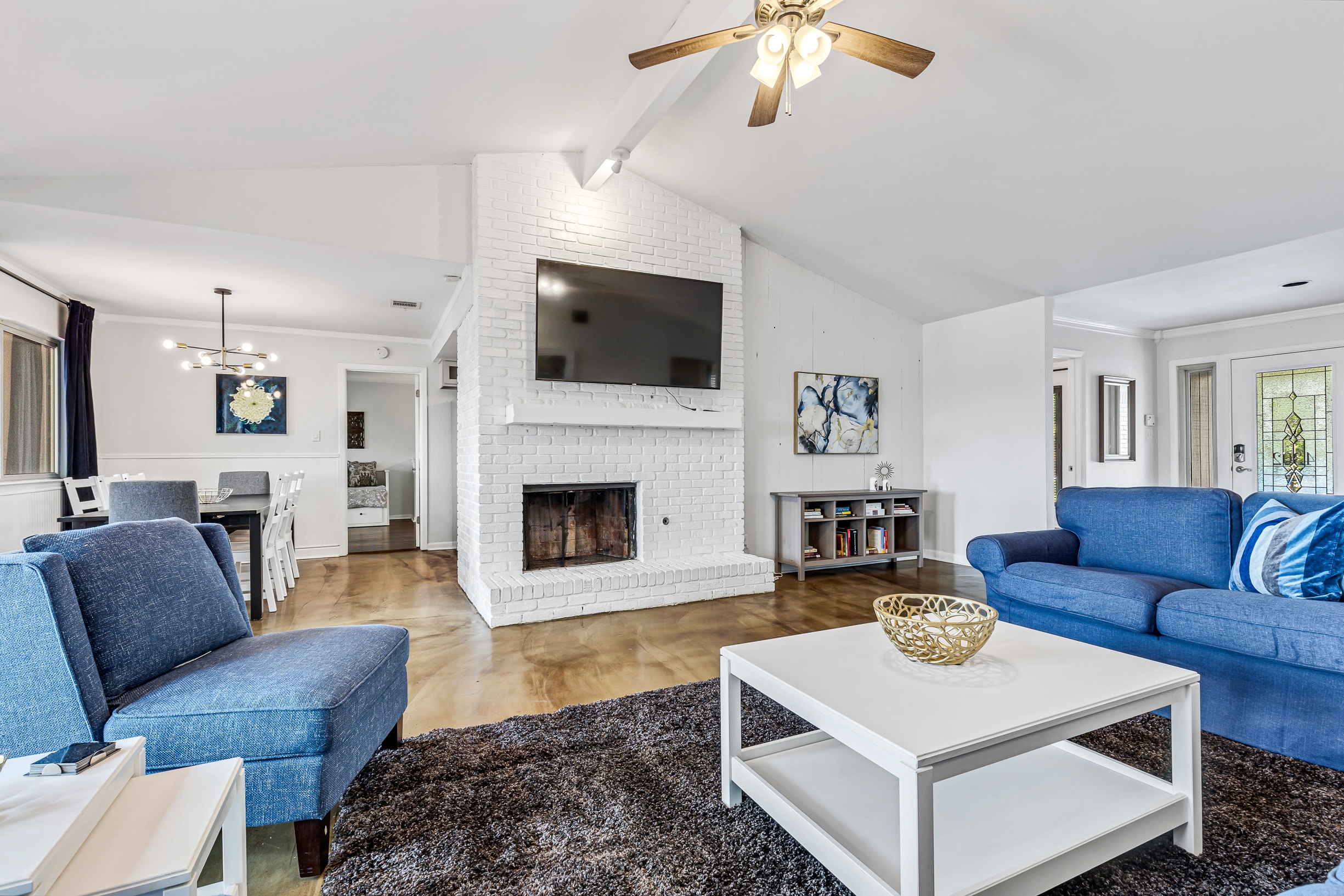 Please note that a $300 refundable security deposit is charged in addition to the total shown. Dogs are allowed with prior approval and a one time $240 pet fee. A beautiful remodeled home overlooking a small private lake. Enjoy the view from the deck, and still have easy highway access to downtown and the Domain. Home has 5 beds and sleeps up to 8 adults or 10 guests total. For the families, we have a pack and play, a high chair, as well as a few toys and games for the kids. The 2200sqft home has gorgeous stained concrete flooring throughout, updated kitchen & bathrooms, huge deck, and a sunroom facing the lake with lots of windows. The kitchen is stunning with all stainless steel appliances, gas range, granite, and glass tile. The bathrooms have custom glass tile tub & shower surrounds, granite counter tops and custom sink vessels. Of course the home has central air and heat throughout as well as ceiling fans in each room. The living room has plenty of seating, and the dining room accommodates up to 8 adults. The large deck has plenty of seating with a patio table and chairs. It truly is a beautiful view - especially at sunset! Please note that the fireplace is decorative only, and the garage is a small 1 car garage. The home has a maximum occupancy of 8 adults and 10 people total. City of Austin has an occupancy limit of 6 unrelated adults. Minimum age requirement of 25 years old. Cats are not allowed; dogs are allowed with prior approval and additional fee. The neighborhood pool, playground, tennis, and volleyball courts are only available for guests staying 30 days or longer. The small lake behind the home is privately owned and although it provides a beautiful view for your stay, guests are not allowed to go on the lake unless they join the recreation center. Minimal, we live a few houses away. The home is in a quiet residential neighborhood with a surprising lake view for being in Austin. It's tucked away yet close to major highways. Please note that the lake is just for the view, and there is no access allowed or possible from the home.