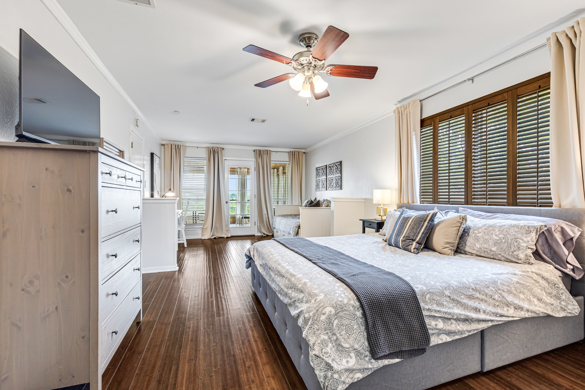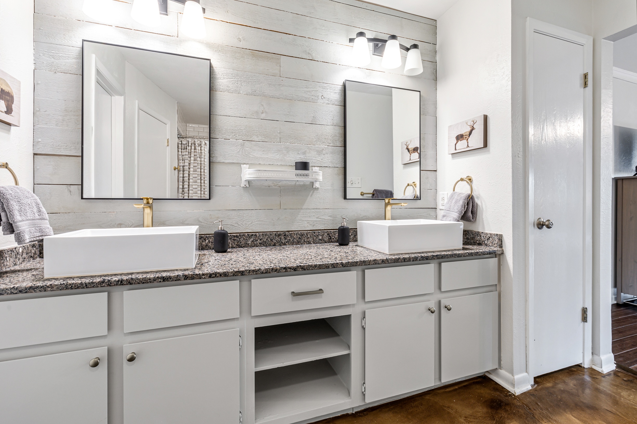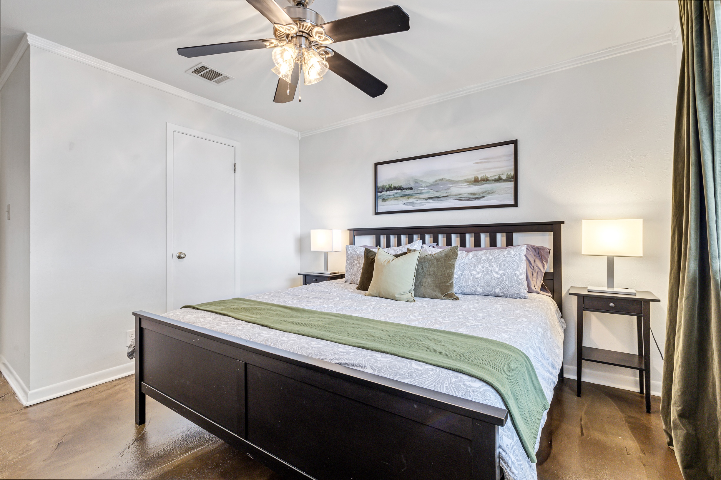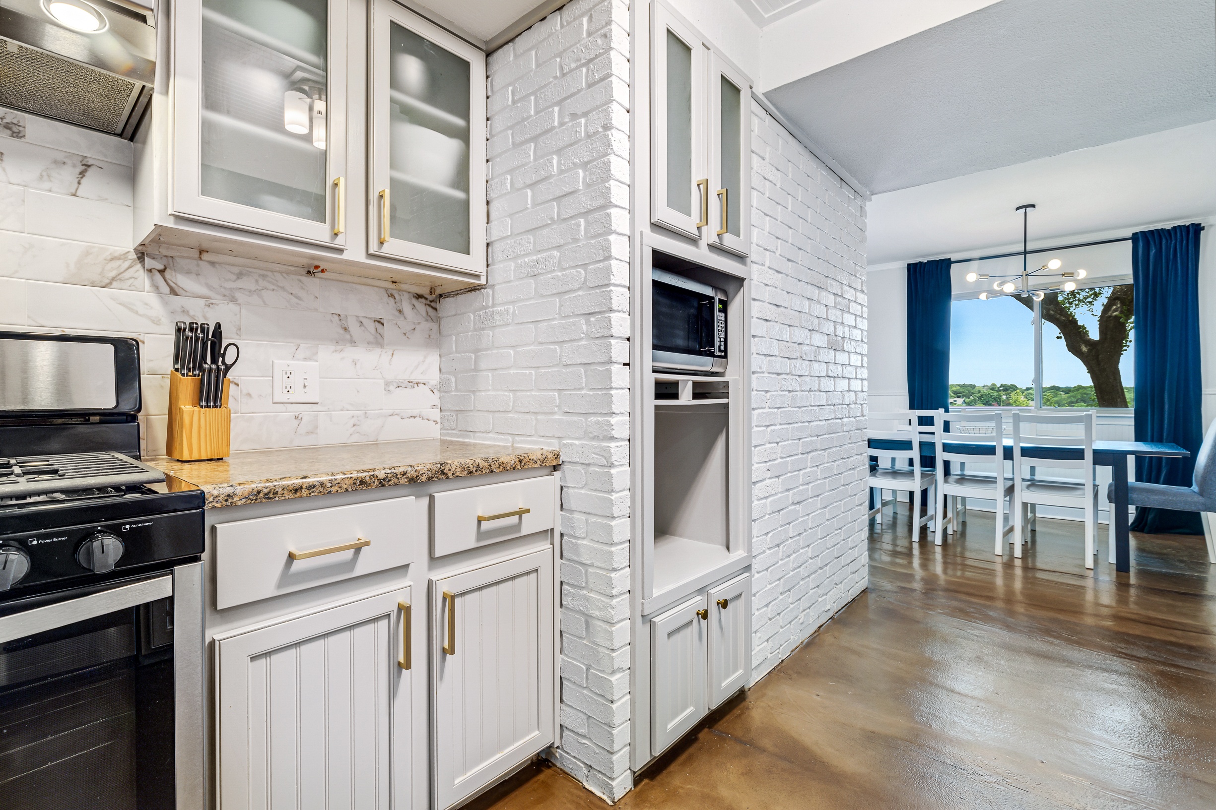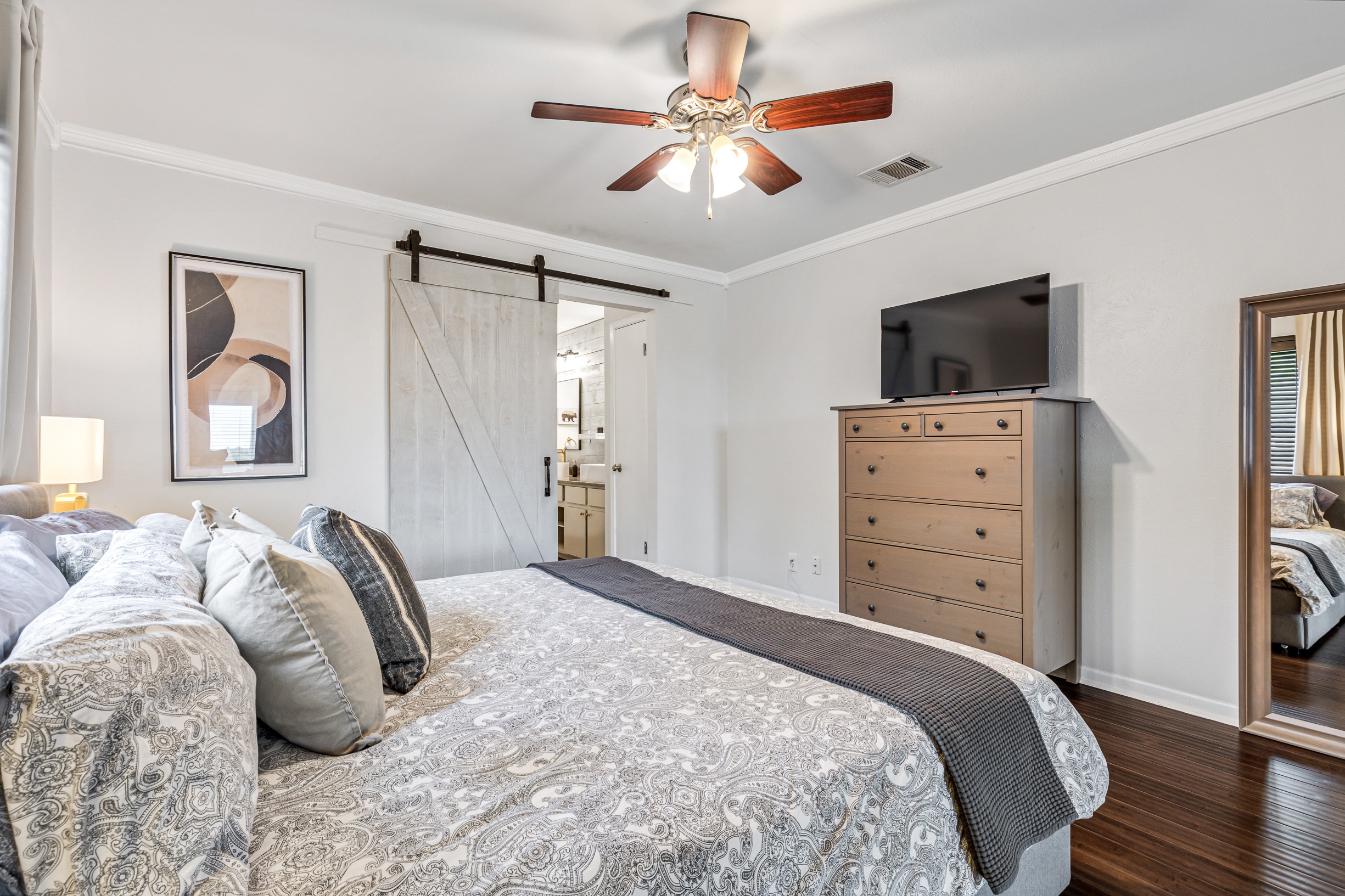 Please note that a $300 refundable security deposit is charged in addition to the total shown. Dogs are allowed with prior approval and a one time $240 pet fee. A beautiful remodeled home overlooking a small private lake. Enjoy the view from the deck, and still have easy highway access to downtown and the Domain. Home has 5 beds and sleeps up to 8 adults or 10 guests total. For the families, we have a pack and play, a high chair, as well as a few toys and games for the kids. The 2200sqft home has gorgeous stained concrete flooring throughout, updated kitchen & bathrooms, huge deck, and a sunroom facing the lake with lots of windows. The kitchen is stunning with all stainless steel appliances, gas range, granite, and glass tile. The bathrooms have custom glass tile tub & shower surrounds, granite counter tops and custom sink vessels. Of course the home has central air and heat throughout as well as ceiling fans in each room. The living room has plenty of seating, and the dining room accommodates up to 8 adults. The large deck has plenty of seating with a patio table and chairs. It truly is a beautiful view - especially at sunset! Please note that the fireplace is decorative only, and the garage is a small 1 car garage. The home has a maximum occupancy of 8 adults and 10 people total. City of Austin has an occupancy limit of 6 unrelated adults. Minimum age requirement of 25 years old. Cats are not allowed; dogs are allowed with prior approval and additional fee. The neighborhood pool, playground, tennis, and volleyball courts are only available for guests staying 30 days or longer. The small lake behind the home is privately owned and although it provides a beautiful view for your stay, guests are not allowed to go on the lake unless they join the recreation center. Minimal, we live a few houses away. The home is in a quiet residential neighborhood with a surprising lake view for being in Austin. It's tucked away yet close to major highways. Please note that the lake is just for the view, and there is no access allowed or possible from the home.