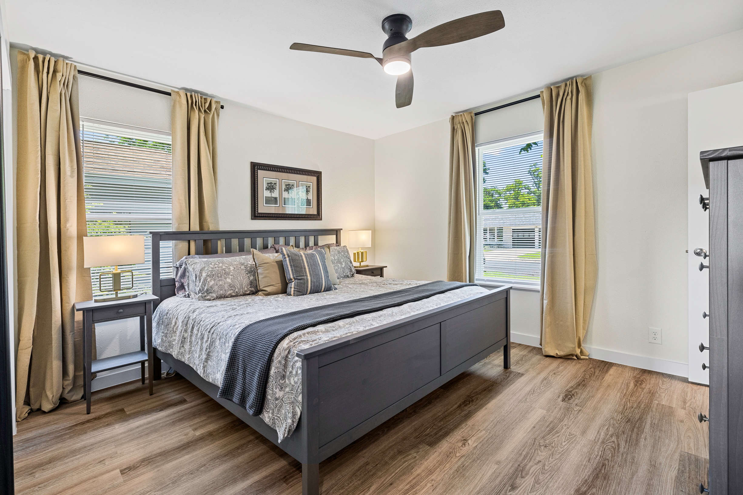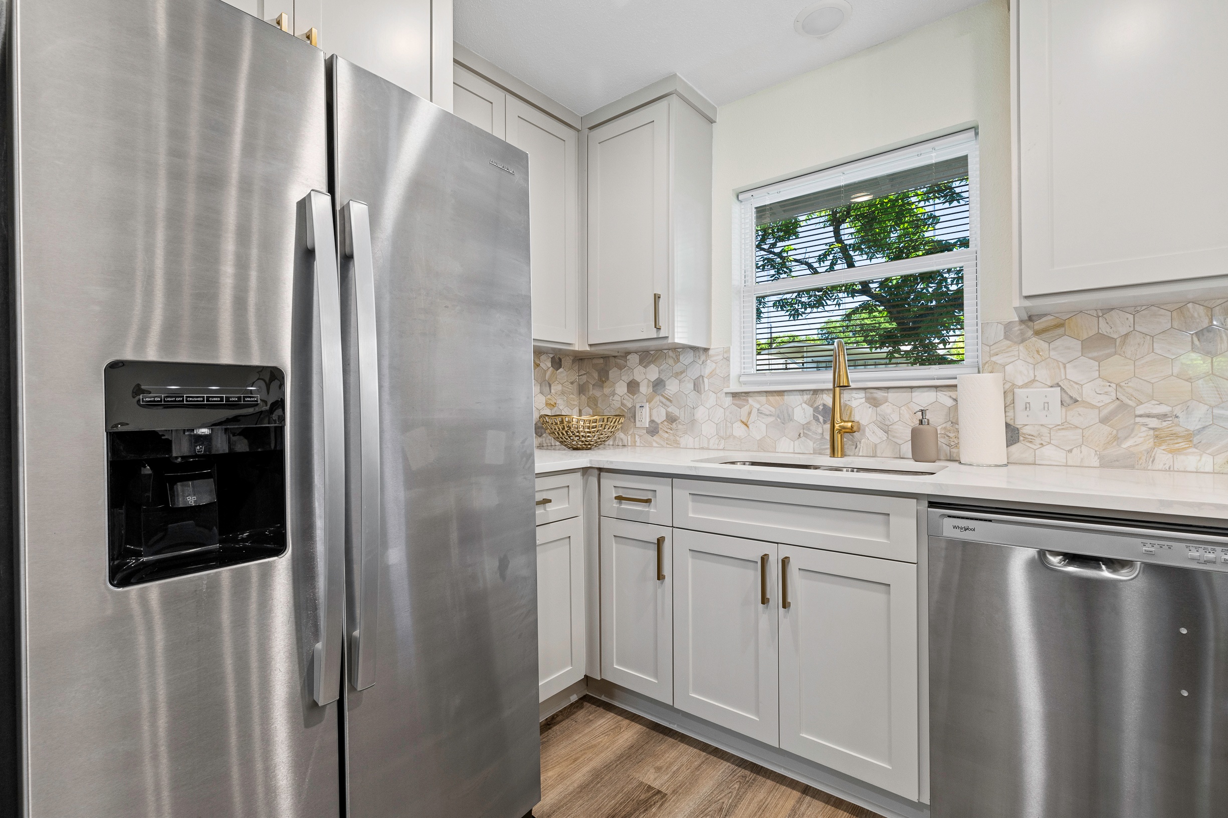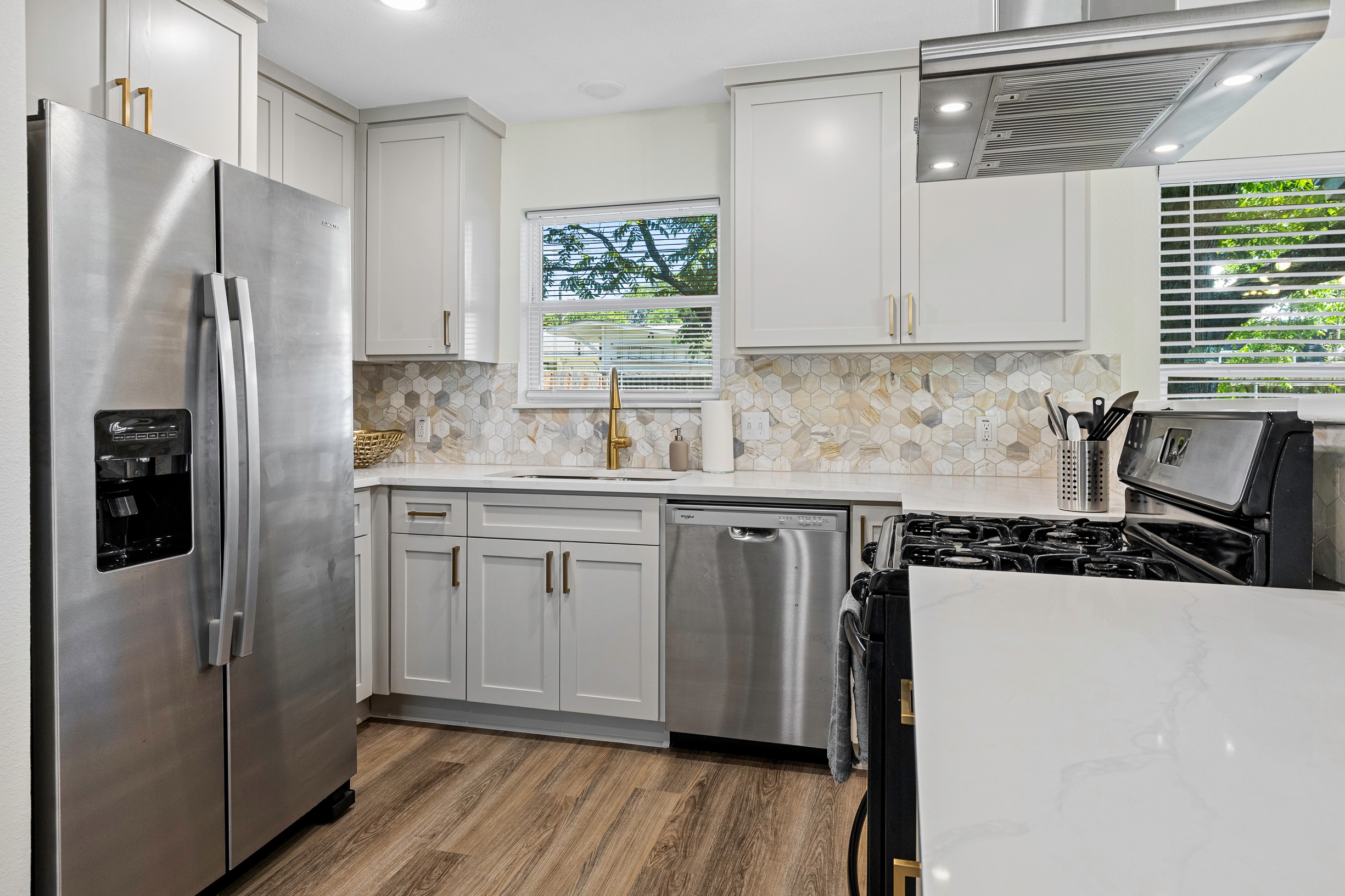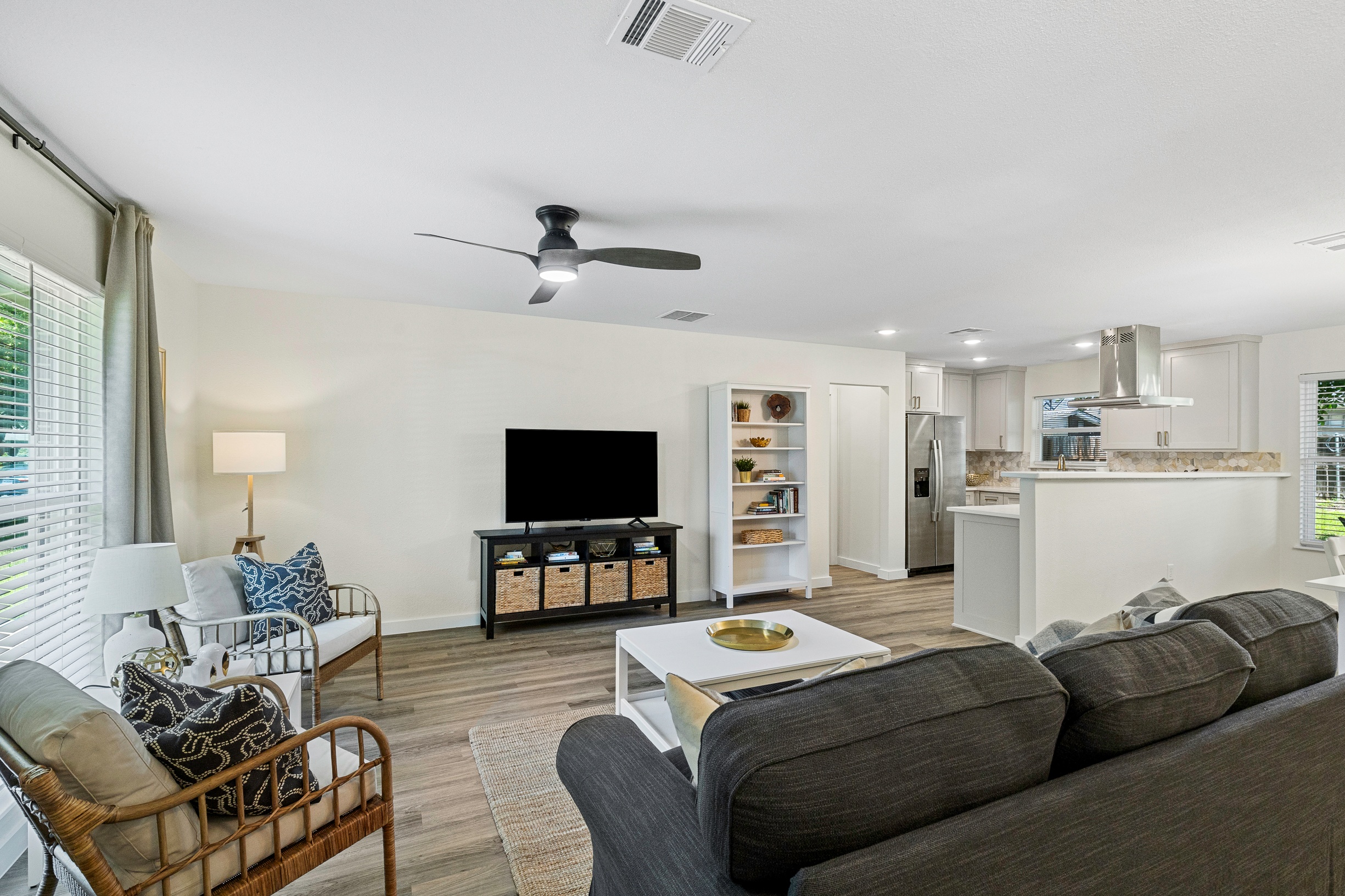 Please note that a $300 refundable security deposit is charged in addition to the total shown. Dogs are allowed with prior approval and a one time $240 pet fee. Beautiful 1 story, 1200 square foot home completely remodeled in 2024 next to Brentwood Park. The home has an updated kitchen complete with stone counters, stainless steel appliances, stone backsplash, and wood-like flooring. The bathrooms have updated stone counters, as well as updated tile, faucets, fixtures, lights, etc... The home has 1 king bed in the primary bedroom, 2 queen beds in each of the secondary bedrooms, and a separate small office with 2 desks. There is a washer and dryer in the laundry room. The backyard boasts a large fenced yard with a small patio with seating. We have high speed internet, and streaming TV services are provided with Disney+, Hulu, and ESPN. Guests are welcome to use their own streaming services as well. The home is located next to Brentwood Neighborhood Park and within a few blocks of the intersection of Burnet Rd & 2222 - close to so much! If you don't feel like cooking the home is a short walk to great Austin food. BBQ, home cooking, and a neighborhood deli are all nearby. The home is ideally situated near the Crestview Rail station which takes you downtown, as well as bus lines running throughout Austin. Maximum occupancy is 6 people total. Primary Bedroom: King bed 2nd Bedroom: Queen bed 3rd Bedroom: Queen Bed Guests have access to the entire home and yard. There to no access to the garage.